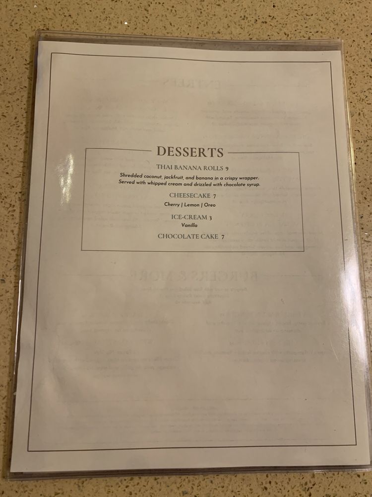 Organic shredded coconut , jackfruit and banana wrapped in a crispy shell and topped with vegan whip cream and chocolate syrup